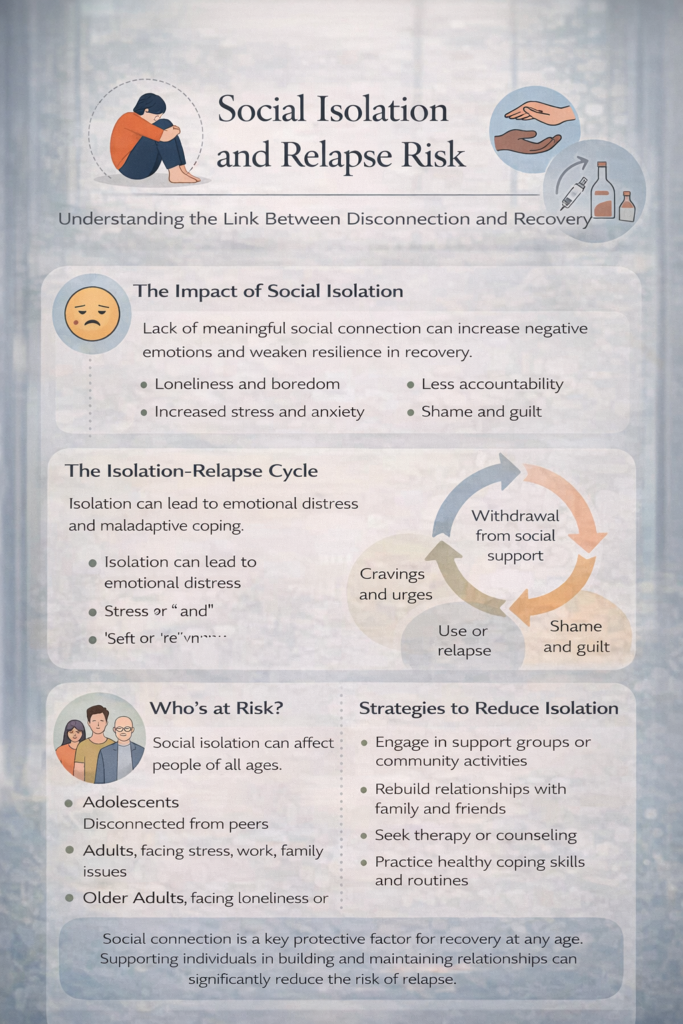 Social isolation—feeling disconnected, unsupported, or alone—can significantly increase the risk of relapse for individuals in recovery from addiction. While relapse is often associated with personal struggle, it is deeply influenced by social and environmental factors, making isolation a critical issue across all age groups.
