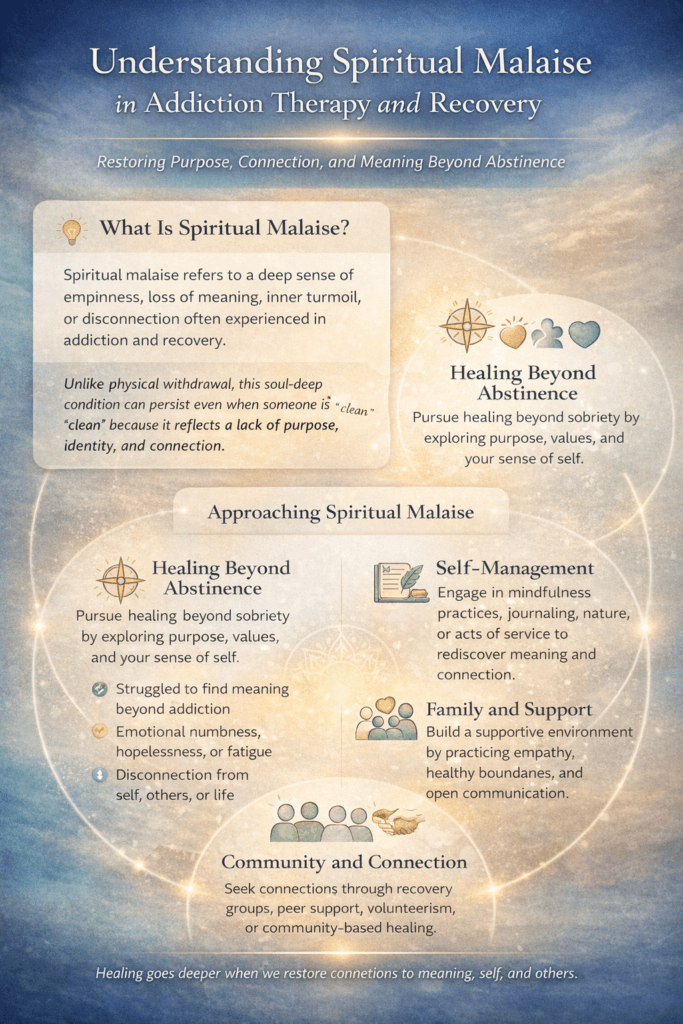Addressing spiritual malaise in addiction therapy and recovery allows healing to move beyond symptom management and toward true restoration of the whole person. When meaning, values, and inner connection are intentionally explored alongside clinical treatment, recovery becomes more sustainable and fulfilling. By integrating therapeutic support with personal reflection, family involvement, and community connection, individuals can rebuild a sense of purpose and belonging that supports lasting change. Healing the spiritual dimension of addiction transforms recovery from merely surviving without substances into living with intention, hope, and a renewed sense of direction.