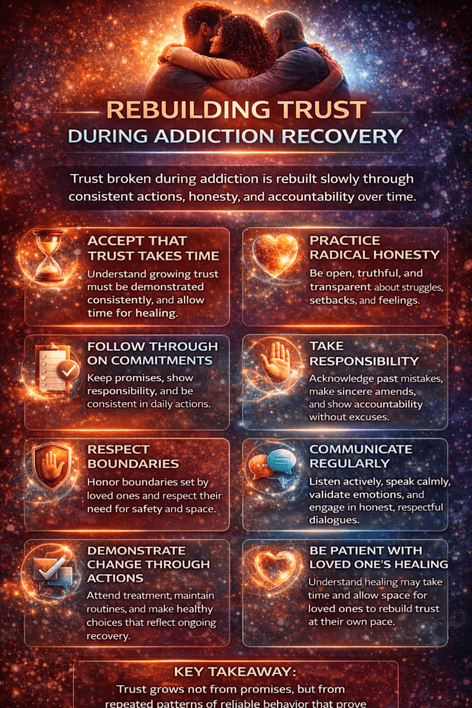 Rebuilding trust during addiction recovery is a gradual and deeply meaningful process that extends beyond sobriety itself. Addiction can strain relationships through broken promises, secrecy, and emotional distance, leaving loved ones uncertain and guarded. Even when recovery begins, trust does not automatically return; it must be rebuilt through consistent actions, honesty, and accountability over time. Understanding this process helps both individuals in recovery and those around them approach healing with realistic expectations, patience, and compassion, creating the conditions necessary for relationships to repair and grow stronger.
