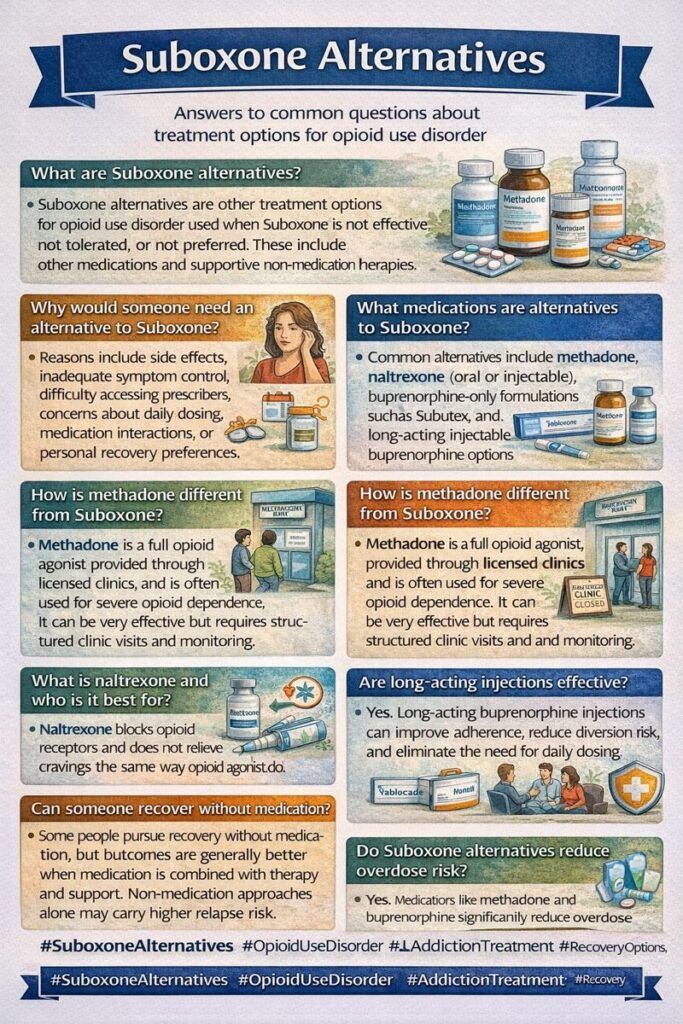 Common alternatives include methadone, naltrexone (oral or injectable), buprenorphine-only formulations such as Subutex, and long-acting injectable buprenorphine options like Sublocade and Brixadi.