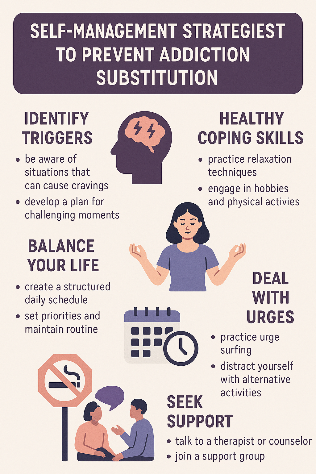 Question: Provide an infographic flyer for self-management strategies on how to prevent Addiction Substitution.