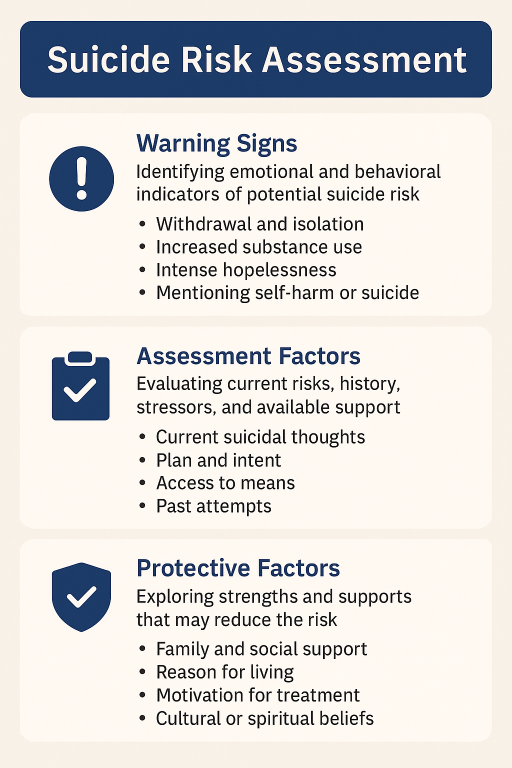 In summary, a suicide risk assessment in crisis counseling is designed to thoroughly understand an individual’s risk level, identify factors that increase or reduce that risk, and take immediate action to ensure safety. By combining structured questioning with empathy; counselors can gain a comprehensive view of the individual’s situation and create a plan that includes immediate intervention and longer-term support. With this approach, crisis counselors not only help prevent suicide in the short term but also connect individuals to resources that foster resilience, coping, and hope for the future.
