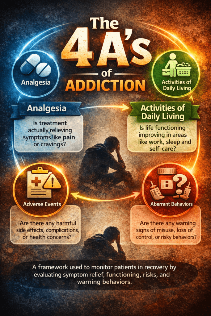 The **4 A’s—Analgesia, Activities of Daily Living, Adverse Events, and Aberrant Drug-Taking Behaviors—**form a structured clinical framework for evaluating patients receiving controlled substances, especially opioids. Originally developed for pain-management monitoring, this model has become highly valuable in addiction medicine because it balances symptom relief with safety, function, and risk assessment. Rather than focusing solely on medication doses or lab results, the 4 A’s provide a multidimensional view of how treatment affects a person’s life, behavior, and health outcomes. This approach aligns with modern addiction care principles emphasizing functional recovery, patient-centered monitoring, and early detection of misuse patterns.