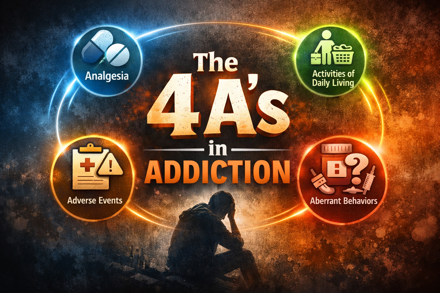The **4 A’s—Analgesia, Activities of Daily Living, Adverse Events, and Aberrant Drug-Taking Behaviors—**form a structured clinical framework for evaluating patients receiving controlled substances, especially opioids. Originally developed for pain-management monitoring, this model has become highly valuable in addiction medicine because it balances symptom relief with safety, function, and risk assessment. Rather than focusing solely on medication doses or lab results, the 4 A’s provide a multidimensional view of how treatment affects a person’s life, behavior, and health outcomes. This approach aligns with modern addiction care principles emphasizing functional recovery, patient-centered monitoring, and early detection of misuse patterns.