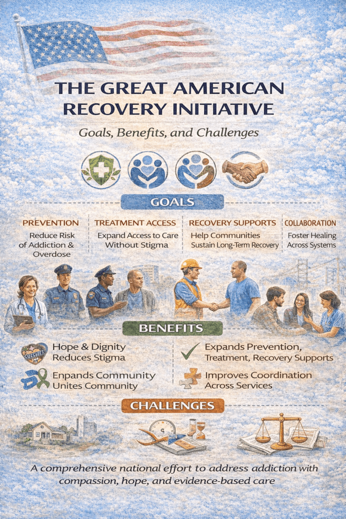 The Great American Recovery Initiative is a broad recovery-oriented framework focused on addressing addiction through prevention, treatment access, long-term recovery support, and community collaboration. It views addiction as a public health issue and emphasizes compassion, evidence-based care, and sustained recovery.