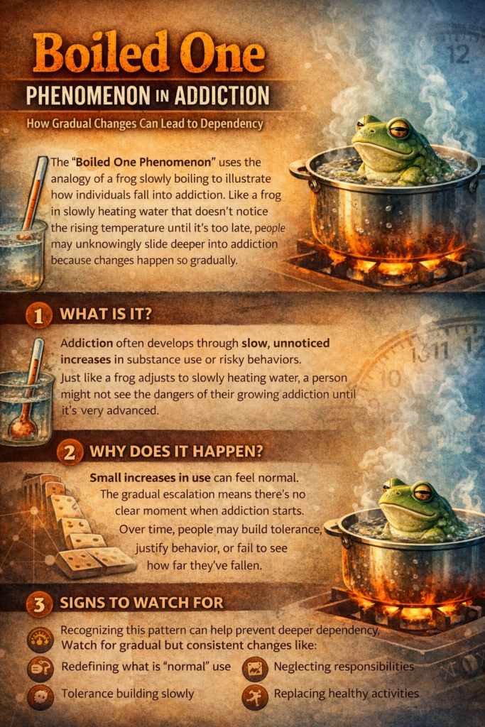 The Boiled One Phenomenon gets its name from that overused yet surprisingly fitting idea of a frog that doesn’t jump out of water as it turns from warm to scalding. In addiction, this is all about gradual changes. People don’t go from casual use to a full-blown problem in one wild leap. It’s more of a small steps thing, where each change feels normal until everything’s different.