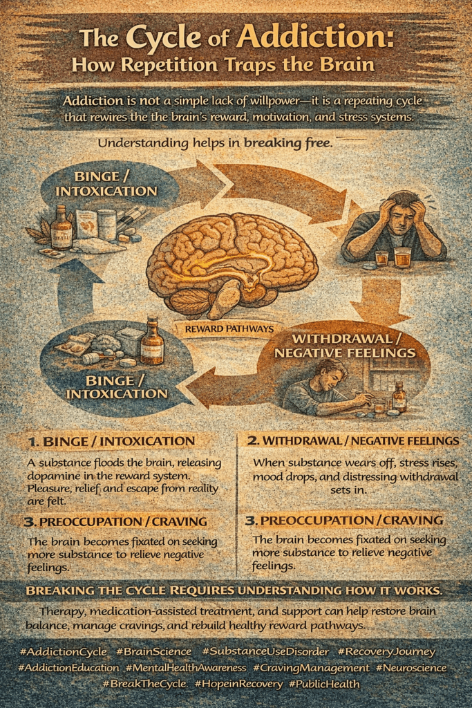 The cycle of addiction is a repeating pattern of substance use, withdrawal, and craving that reinforces continued use and makes stopping difficult.