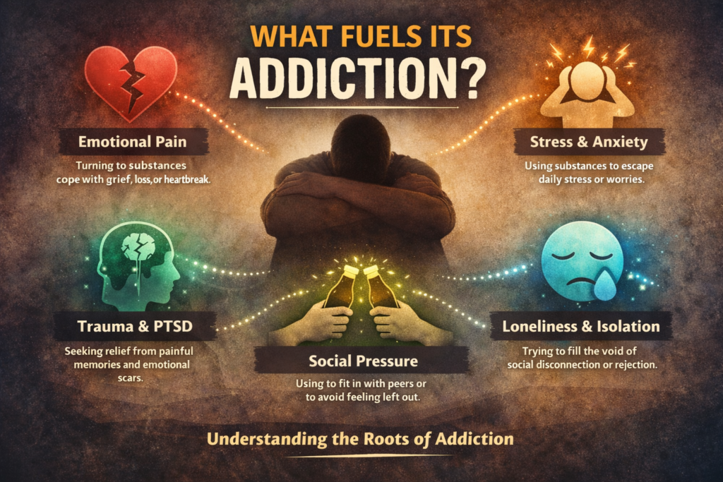 “What fuels addiction” refers to the underlying factors that drive or sustain addictive behaviors. These factors often include emotional pain, stress, trauma, mental health challenges, social pressure, and feelings of isolation that push individuals toward substances or compulsive activities for relief.