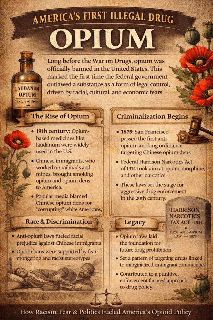 Opium entered the U.S. with Chinese immigrants in the 19th century, particularly during the California Gold Rush. While opium was part of Western medicine too, “opium dens”—places where people smoked the drug—became linked with Chinese communities, especially in San Francisco.