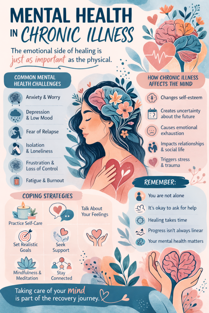 Recovering from a chronic illness can feel like a true mental and physical roller coaster. While people often focus on the physical side of healing—managing symptoms, attending appointments, and slowly rebuilding strength—the emotional side of recovery can be just as challenging. Whether someone is learning to live with a lifelong condition or recovering from a severe flare-up or period of illness, the process often brings uncertainty, frustration, and emotional strain. Many individuals experience anxiety about their health, fear of symptoms returning, or feelings of isolation as their daily routines change. At the same time, adjusting to new limitations or lifestyle changes can impact confidence, independence, and overall well-being. Despite how common these emotional struggles are, they are frequently overlooked in conversations about recovery. Understanding how chronic illness affects mental health is an important step toward supporting both the body and the mind during healing. By recognizing these challenges and exploring healthy coping strategies—such as building strong support systems, practicing self-care, and seeking professional help when needed—individuals can better navigate recovery and protect their mental well-being.