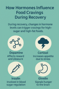 Several factors contribute to fluctuations in your hormones (and, consequently, your cravings) during recovery periods. Here are a few main factors to keep in mind: