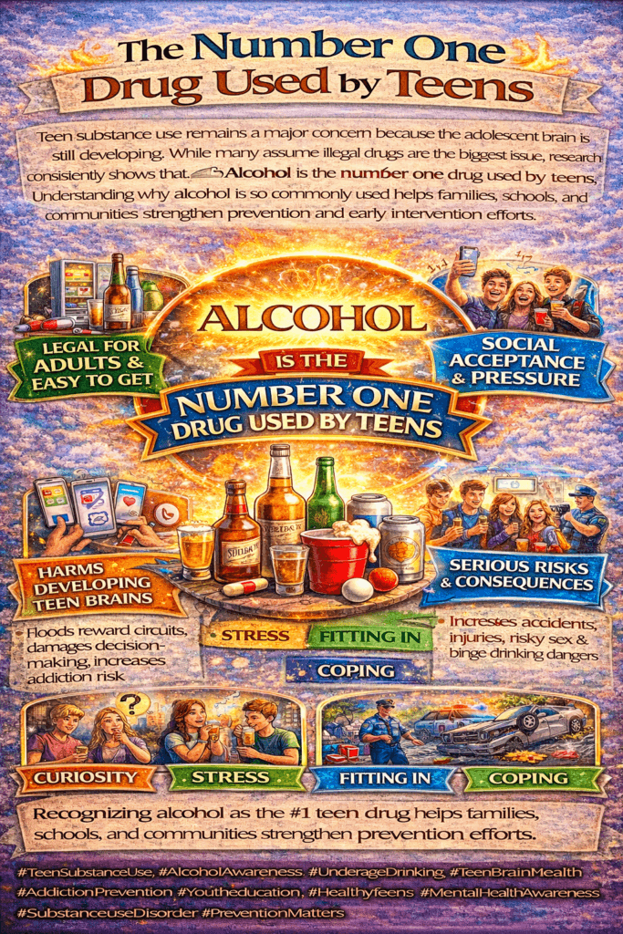 Answer: Alcohol tops the list for teens because it’s easy to find, accepted in many homes, and not viewed as very risky compared to other substances.