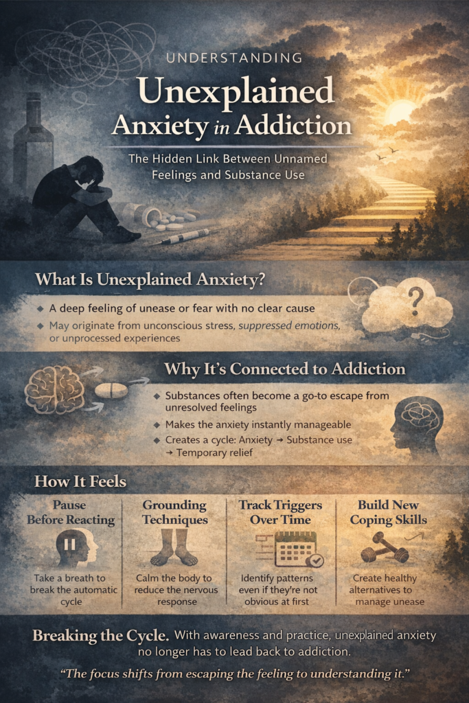 Addressing unexplained anxiety in addiction requires a shift from seeking immediate answers to building tolerance, awareness, and healthier coping strategies. Rather than viewing the anxiety as meaningless or irrational, it can be understood as a signal of underlying processes that are not yet fully recognized. With time, support, and self-management, individuals can learn to experience this anxiety without relying on substances for relief. As understanding grows, the intensity and influence of the anxiety often decrease. Ultimately, recovery is not about eliminating anxiety completely, but about developing the ability to face it with greater clarity, resilience, and control.