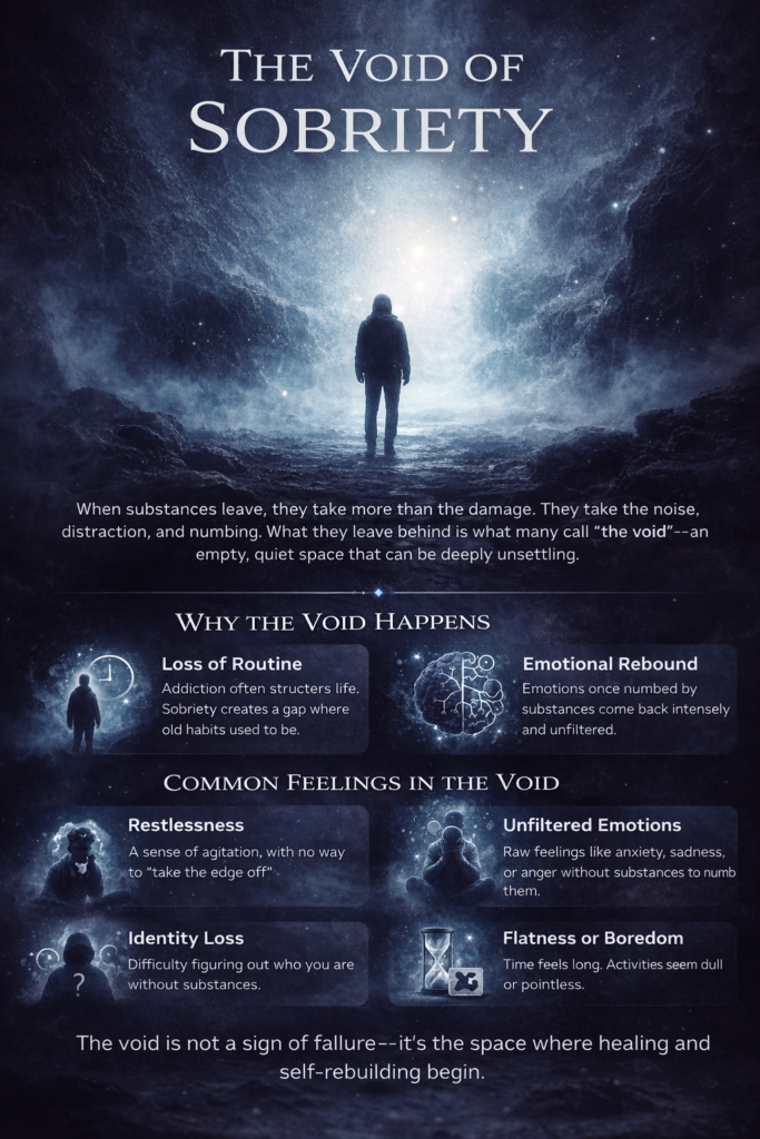 This is the void of sobriety—not just the absence of substances, but the absence of what they once provided: escape, numbing, stimulation, or relief.