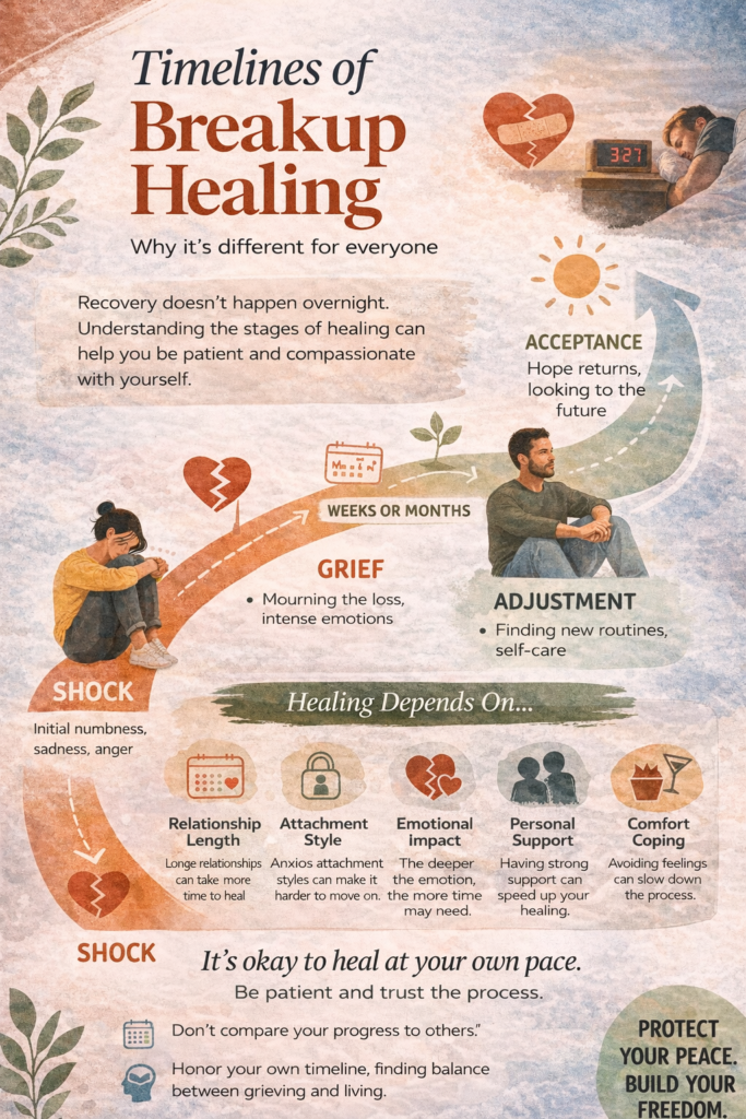 Breakup healing is personal. Some people bounce back in a few weeks, while others might need months or longer. There’s no “correct” timeline, but there are a few factors that tend to shape the pace of recovery: