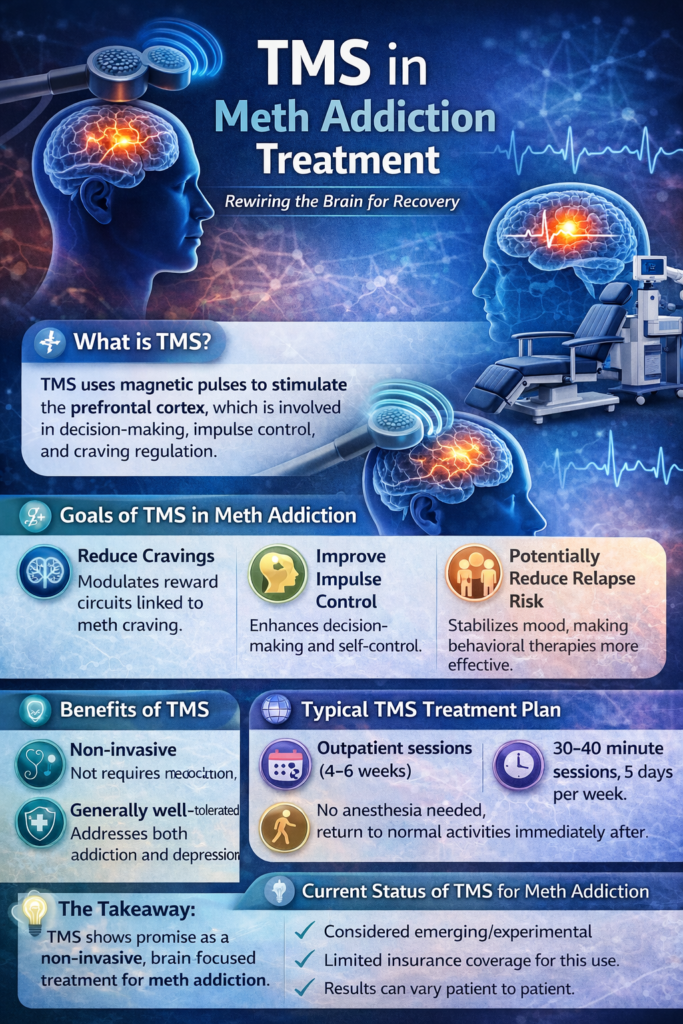 TMS offers a novel and potentially impactful approach to treating methamphetamine use disorder by focusing on the underlying brain circuitry that drives cravings and relapse. While research is still evolving, early findings suggest that TMS can reduce craving intensity and support improved self-regulation, especially when integrated into a comprehensive treatment plan. However, it is not a standalone solution—long-term recovery continues to depend on consistent engagement, psychosocial support, and access to resources. As understanding of TMS grows, it may become an important component of modern addiction treatment, providing new hope for individuals seeking recovery from meth addiction.