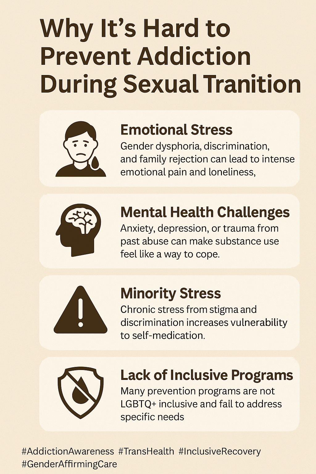 Preventing addiction during a sexual transition is difficult due to emotional distress, mental health challenges, social stigma, healthcare barriers, and financial instability. However, strong support systems, access to mental health care, and gender-affirming resources can significantly reduce the risk. Addressing these issues holistically—through therapy, peer support, and inclusive healthcare—can help individuals navigate their transition while maintaining sobriety.