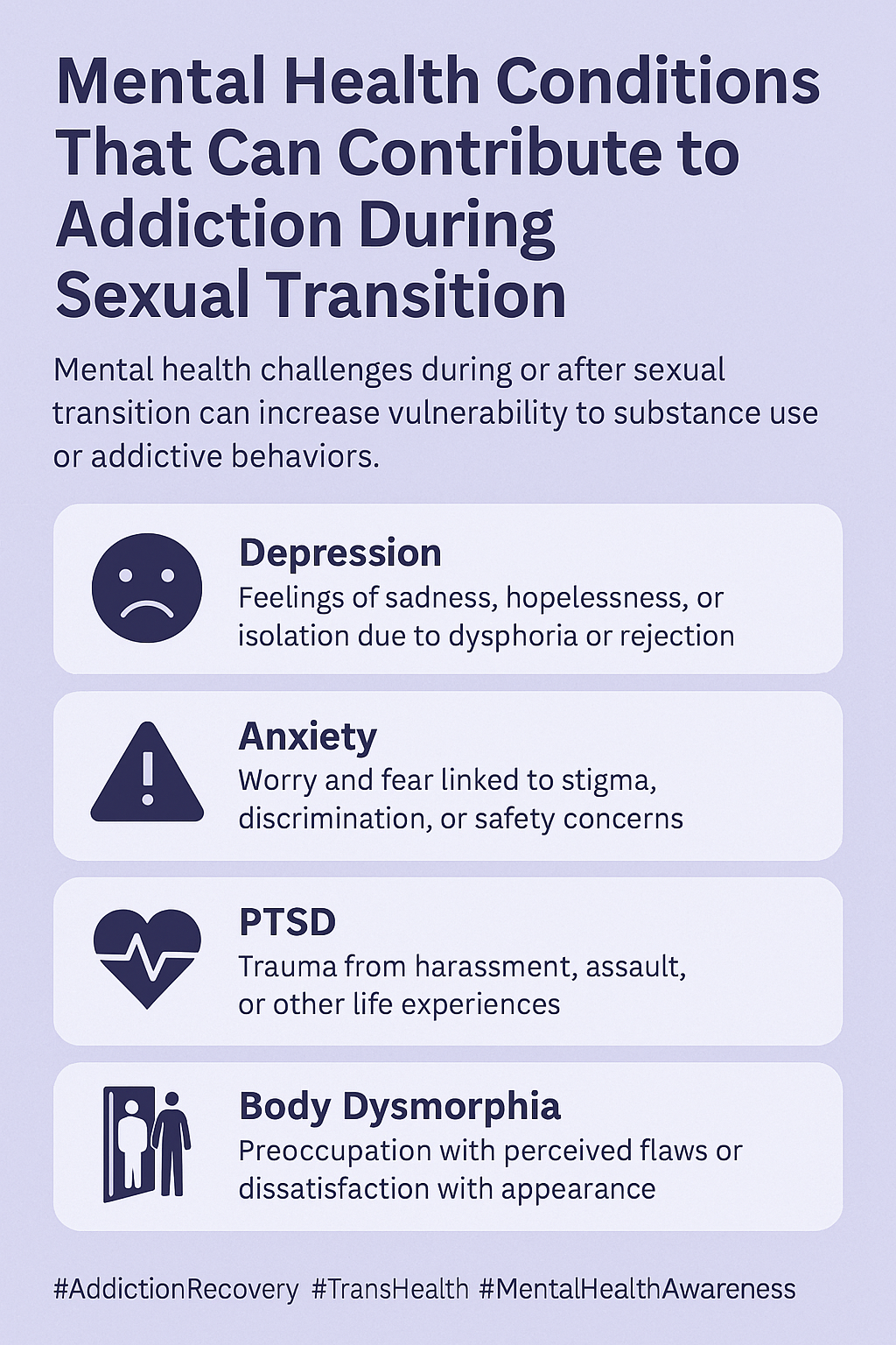 Sexual transition itself does not directly cause addiction, but the emotional, social, and psychological challenges associated with it can increase the risk of substance use. Many individuals undergoing gender transition face stigma, discrimination, rejection, or internalized distress. These struggles can lead to feelings of isolation, anxiety, or depression, increasing vulnerability to substance use as a coping mechanism.