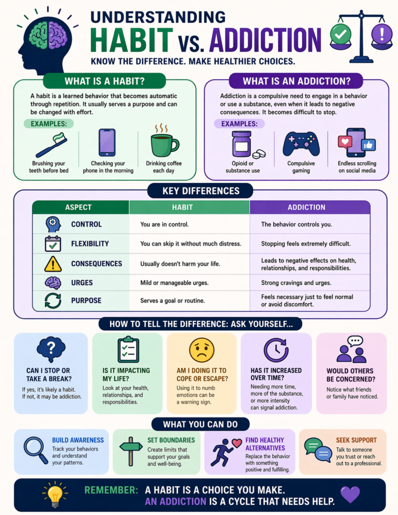 Understanding the difference between a habit and an addiction is essential—not only for awareness, but for recognizing when a behavior may require change or support.