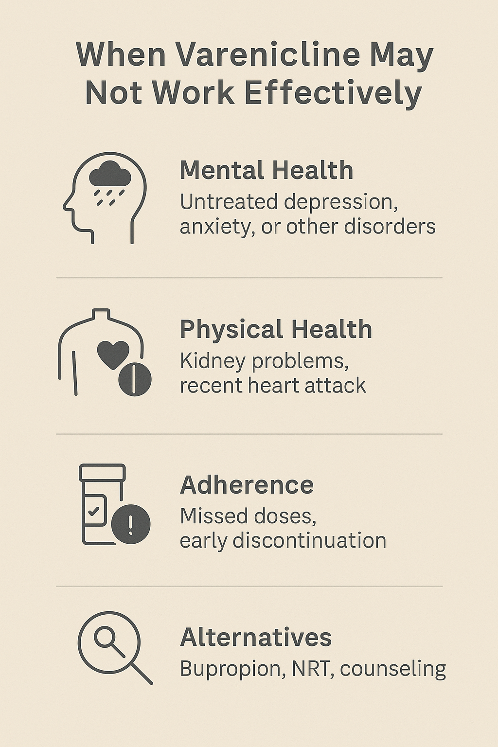 Answer: Varenicline, a medication commonly used to help people quit smoking, may not be effective or appropriate in certain conditions. Some of these include: