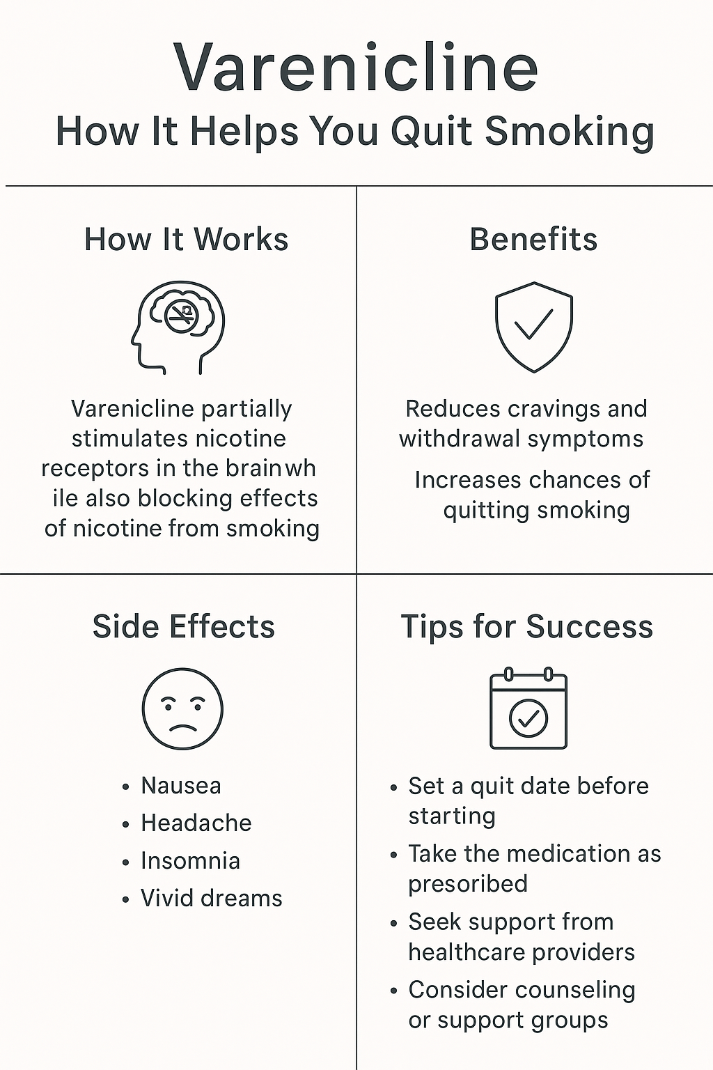 Varenicline offers a comprehensive approach to quitting smoking by reducing cravings, blocking the pleasurable effects of nicotine, and helping individuals stay smoke-free. Its high success rate and non-nicotine formula make it a powerful tool in overcoming nicotine addiction. As with any medication, individuals should consult a healthcare provider to determine if varenicline is the right choice for their smoking cessation journey.