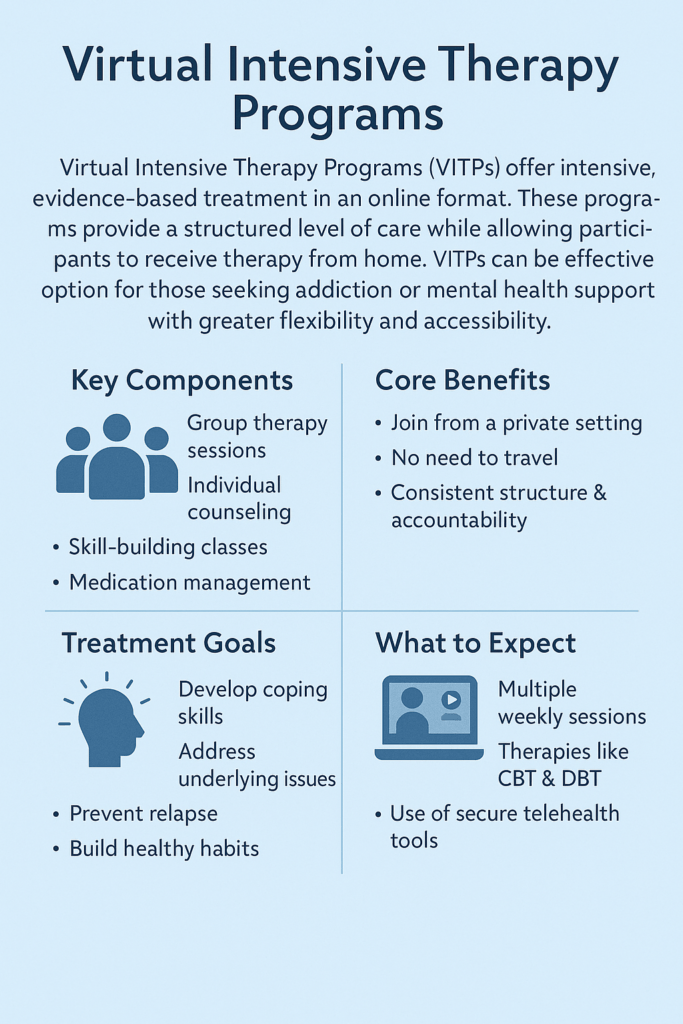 Virtual Intensive Therapy Programs are rapidly becoming a go-to option for people seeking meaningful mental health support without leaving home. Instead of committing to weeks in a clinic or hospital setting, individuals can now participate in structured, high-impact treatment entirely online. These programs blend frequent video therapy sessions, virtual group work, skills training, and guided exercises that continue between sessions—all accessible through a laptop, tablet, or phone. This model allows people to receive care similar to partial hospitalization or intensive outpatient programs, but with far greater flexibility and privacy. In this article, I’ll walk you through how Virtual Intensive Therapy Programs operate, what sets them apart from traditional therapy, the key benefits and potential drawbacks, and the essential factors to consider before enrolling.
