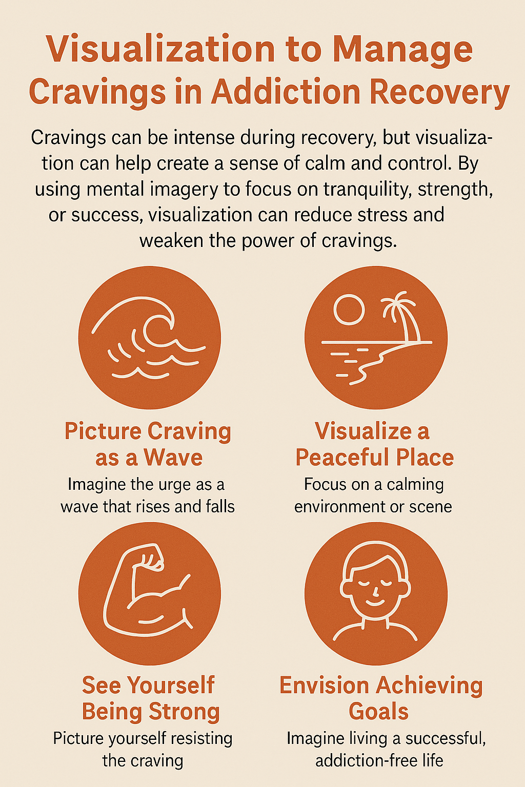 Counselors and therapists often use visualization to help people ease anxiety, sharpen their focus, and stay committed to their intentions. This approach fits perfectly when you’re dealing with cravings, since visualization lays out a calmer game plan beyond just white knuckling your way through.