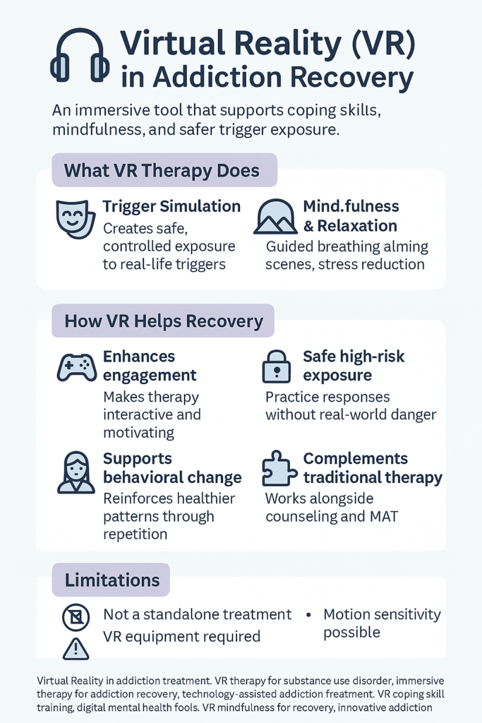 Virtual Reality offers innovative and engaging ways to support addiction recovery through controlled exposure, enhanced cognitive behavioral therapy, stress management, and increased motivation. While the benefits are promising, VR should complement traditional treatments, providing a comprehensive approach to addiction recovery.