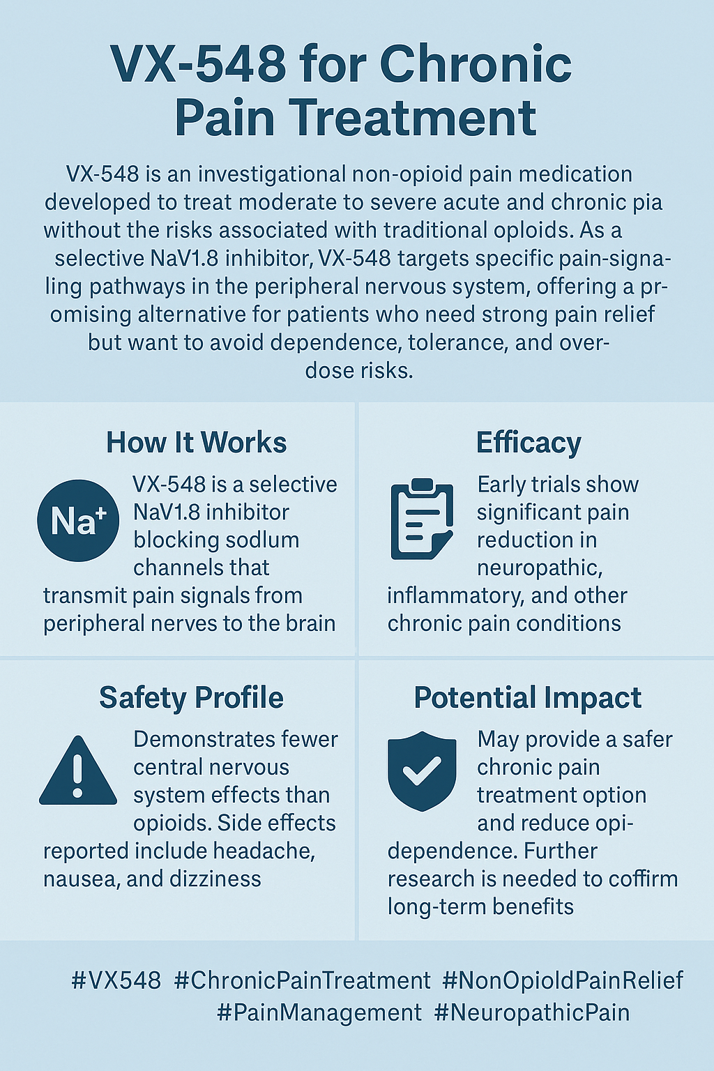 VX-548 represents a potential breakthrough in chronic pain treatment by providing a non-opioid alternative that specifically targets pain pathways while avoiding addiction risks. With its selective action on Nav1.8 sodium channels, VX-548 aims to offer effective pain relief with fewer side effects compared to conventional therapies. As research progresses, it could become a valuable option for patients seeking safer and more sustainable pain management solutions.