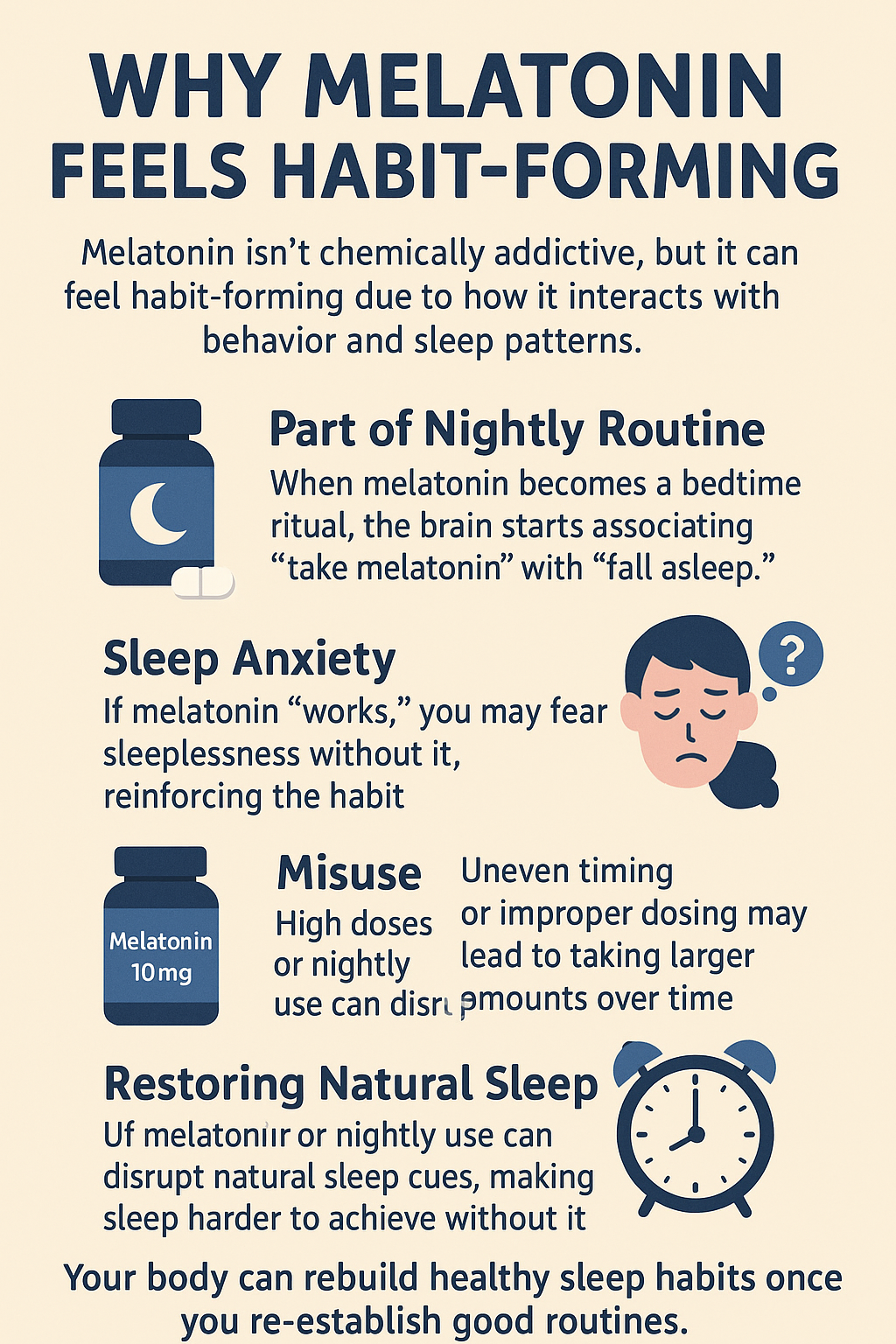 People often say they are “addicted” to melatonin, but what they’re experiencing is psychological dependence—a habit loop and sleep anxiety—not true addiction.