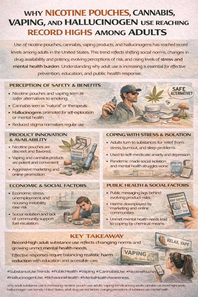 Substance use among adults is rising quickly as nicotine pouches, cannabis, vaping, and hallucinogens become more visible and accessible. This article examines the factors behind these changes and highlights important health considerations for anyone seeking clarity or guidance.