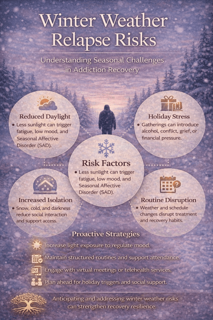 Winter weather relapse risks are often underestimated in addiction recovery planning. Seasonal changes bring shorter daylight hours, colder temperatures, disrupted routines, and increased social isolation—factors that can significantly impact mood, motivation, and coping capacity. For individuals in recovery, these environmental stressors may intensify cravings, depressive symptoms, and emotional vulnerability. Holiday gatherings can add exposure to alcohol, family conflict, or financial pressure. Travel limitations and inclement weather may reduce access to meetings, therapy, or peer support. Because recovery stability relies heavily on structure, connection, and emotional regulation, winter presents predictable challenges that require proactive awareness rather than reactive response. Understanding the seasonal patterns that influence relapse risk allows individuals, families, clinicians, and communities to strengthen protective strategies before vulnerability escalates.