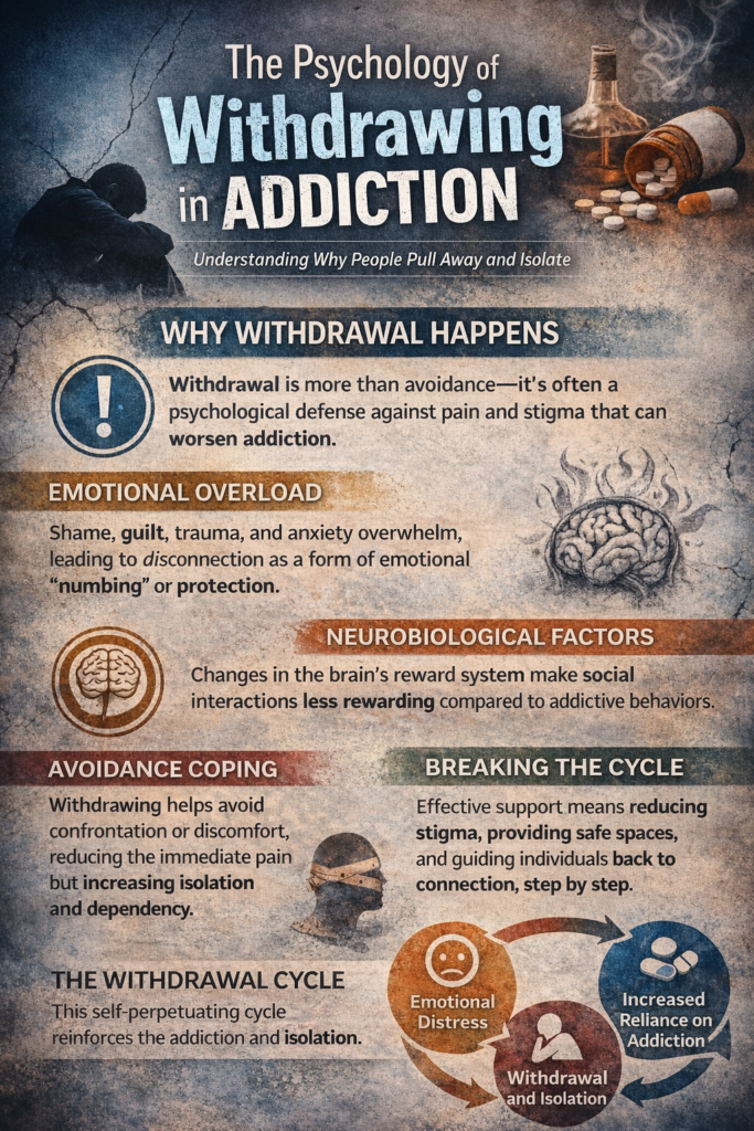 Withdrawal in addiction is more than a behavioral symptom—it is a reflection of deeper psychological processes that influence how individuals cope with pain, stigma, and vulnerability. While it may serve as a short-term defense, prolonged isolation often intensifies emotional distress and strengthens dependence on addictive behaviors. Recognizing withdrawal as a meaningful, albeit maladaptive, response allows for a more compassionate and effective approach to recovery. By addressing the underlying emotions, reducing stigma, and fostering supportive connections, it becomes possible to break the cycle of isolation. Ultimately, recovery is not only about overcoming addiction but also about rebuilding the capacity for connection, engagement, and self-understanding.
