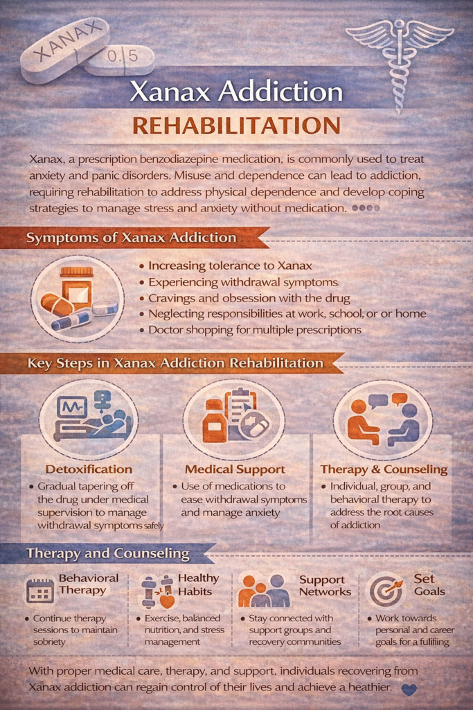 Rehabilitation from Xanax addiction is a complex but achievable process that involves medical care, therapeutic support, and long-term lifestyle changes. Effective recovery often includes supervised detoxification, counseling, behavioral therapy, and strong support systems from family and community resources. With proper treatment and ongoing commitment, individuals can regain control of their lives and learn healthier ways to manage anxiety and stress without relying on medication. By increasing awareness and access to rehabilitation services, individuals affected by Xanax addiction can find the guidance and support needed to build a stable and lasting recovery.