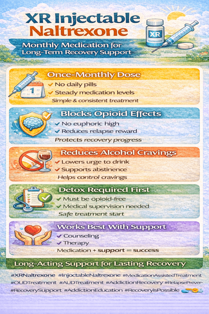 Extended-release injectable naltrexone (XR-naltrexone) has emerged as a significant advancement in the treatment of opioid dependence and alcohol use disorder (AUD). This medication is administered monthly, offering a practical and effective approach for individuals seeking recovery. Here’s a closer look at how XR-naltrexone works and its benefits in addiction treatment.